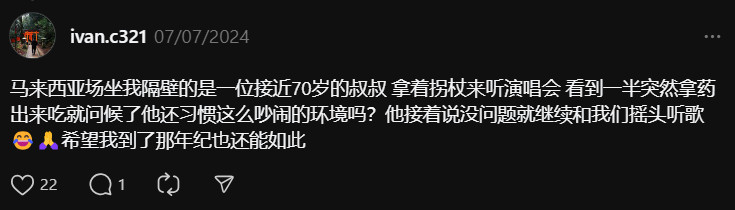 "Trước đây tôi đã đến concert ở Đài Loan và có hai dì ngồi phía sau tôi, tầm hơn 50 tuổi. Vừa nãy thấy có người hỏi theo đuổi idol ở tuổi 40 có phải là quá muộn? Tôi muốn nói rằng tuổi tác không phải là vấn đề. Ở tuổi 30 - 40, bạn có nhiều nguồn lực và tiền bạc hơn và bạn có thể theo đuổi tình yêu đích thực của mình."