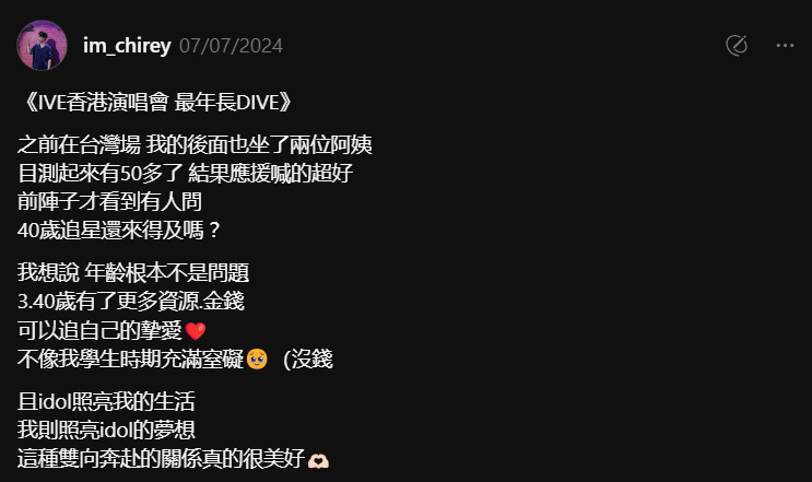 IVE hút fan trung niên đông đảo có lẽ nhờ phong cách đáng yêu, thân thiện. Hình ảnh các khán giả lớn tuổi đến xem concert của IVE cũng khiến cộng đồng mạng vừa "lụy tim" lại vừa "xin vía", mong bản thân cũng đủ tài chính và đặc biệt là sức khỏe để theo đuổi những điều mình yêu thích trong tương lai.