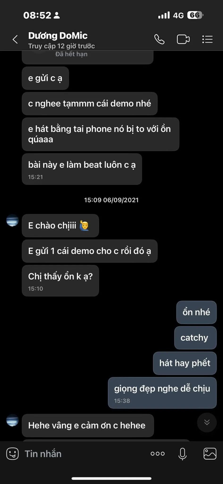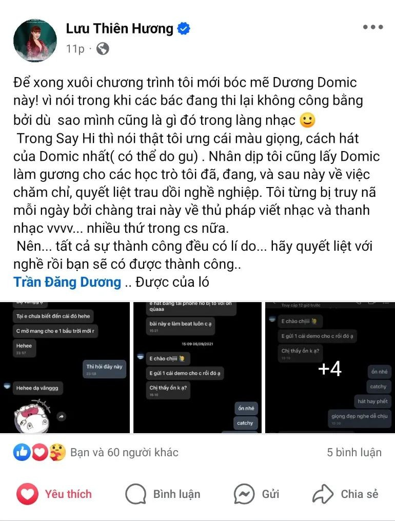 Ngày 1/10, nhạc sĩ Lưu Thiên Hương tiết lộ những đoạn tin nhắn cũ "bóc mẽ" Dương Domic: "Tôi từng bị truy nã mỗi ngày bởi chàng trai này về thủ pháp viết nhạc và thanh nhạc... nhiều thứ trong cuộc sống nữa". Cô khen ngợi tinh thần làm nghề và chia sẻ lấy Dương Domic làm tấm gương cho các học trò của mình.