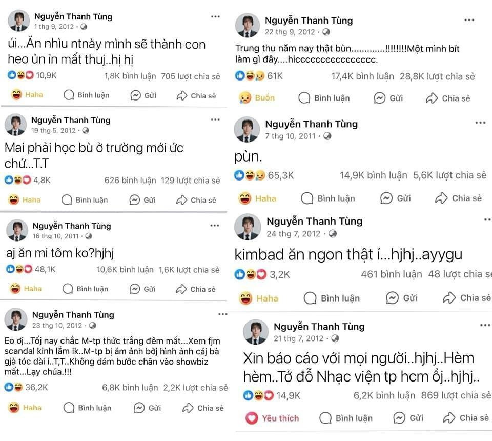 Không chỉ fan mà cư dân mạng cũng "cười ngất" vì độ "vô tri", "dưỡng thê" khi đọc những status của Sơn Tùng M-TP 10 năm trước được tổng hợp lại. Nam ca sĩ chăm chỉ cập nhật cuộc sống thường ngày, dùng teencode, than buồn, khen đồ ăn ngon...