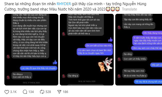 Trên Threads, một dòng trạng thái đăng lại những đoạn tin nhắn của Rhyder gửi thầy giáo của mình - tay trống Nguyễn Hùng Cường từ 4 năm trước, đang viral. Nam nghệ sĩ "gieo thương nhớ" vì cách nói chuyện lễ phép. Dưới bài đăng, các fan cũng chia sẻ lại nhiều mẩu chuyện nhỏ giữa Rhyder và thầy cô của anh: