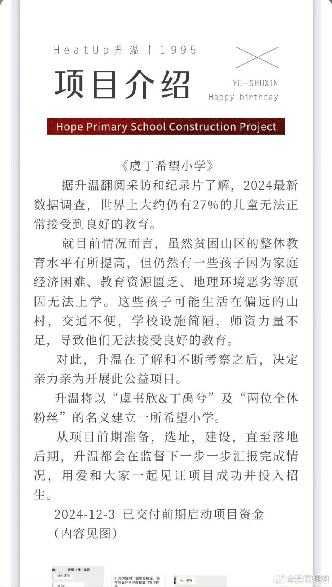 Nhân dịp sinh nhật của Ngu Thư Hân, một fanbase đã đăng văn bản xác nhận xây dựng trường Tiểu học Hy vọng Đinh Ngu (ghép họ của Đinh Vũ Hề và Ngu Thư Hân), với mong muốn những trẻ em ở vùng khó khăn có nơi khang trang, hiện đại để học tập. Trường được xây dựng với danh nghĩa của Đinh Vũ Hề, Ngu Thư Hân và cộng đồng người hâm mộ.
