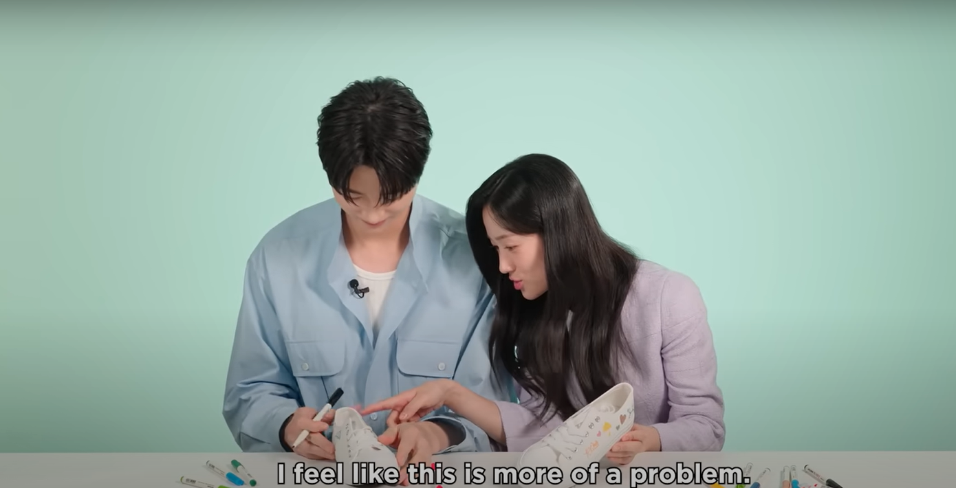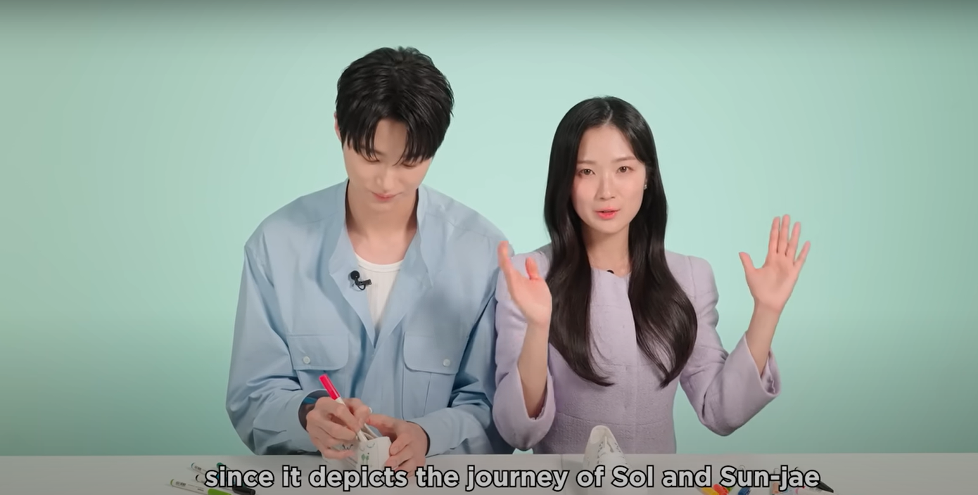 Trong buổi phỏng vấn, Byeon Woo Seok và Kim Hye Yoon trang trí chiếc giày theo tông màu của Lovely Runner. Nếu Hye Yoon để lại chữ ký ở một bên giày thì Woo Seok làm chữ ký ẩn ở phần buộc dây. Cả hai chia sẻ về nhóm nhạc K-Pop mình yêu thích, bài hát nghe gần đây, MBTI hay điểm chính đáng chú ý trong Lovely Runner.