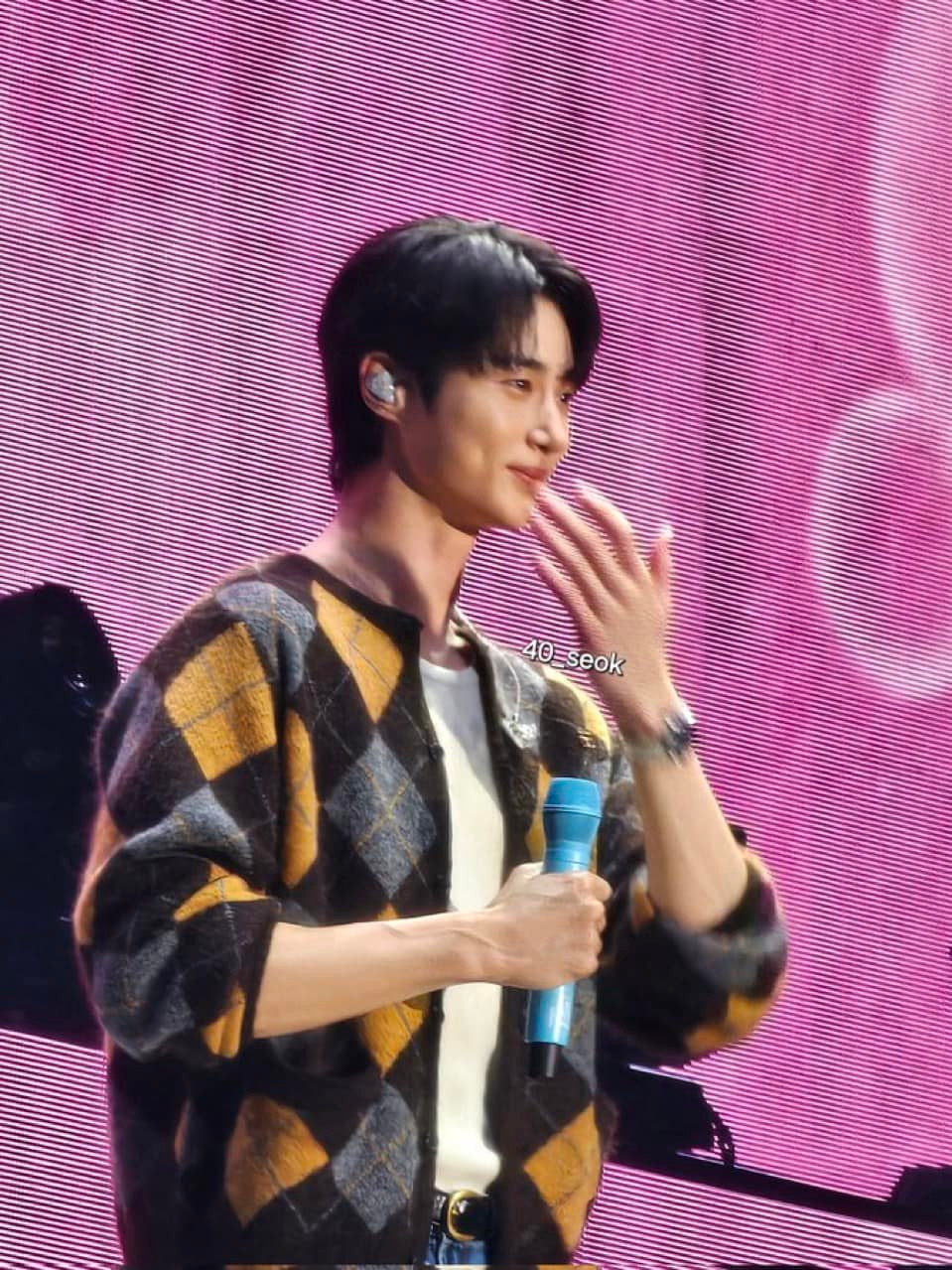 Ở điểm đến fan meeting nào, mỗi khi xuất hiện, Byeon Woo Seok đều khiến dân tình sốc visual. Với fan meeting tại Nhật Bản, điều này không ngoại lệ. Nam diễn viên nổi bần bật khi diện chiếc cardigan họa tiết quả trám với gam màu xanh vàng chủ đạo ở nửa đầu fan meeting. Anh đổi qua cardigan đen kim tuyến bắt mắt cho phần sau chương trình.