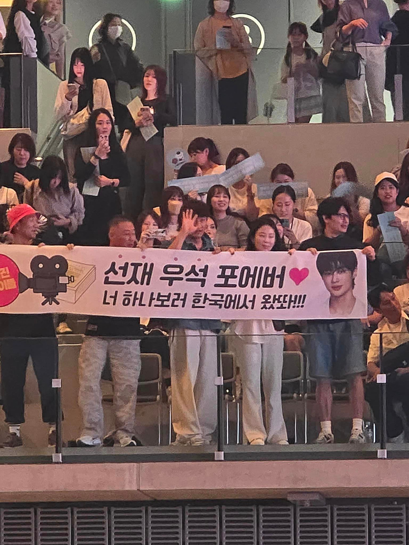 Không chỉ hàng nghìn người hâm mộ, đạo diễn cùng một số nhân viên chủ chốt của bộ phim Lovely Runner cũng tới fan meeting để ủng hộ Byeon Woo Seok. Người hâm mộ đều thích thú trước những lời nhắn nhủ đáng yêu của team Lovely Runner gửi gắm tới nam diễn viên.