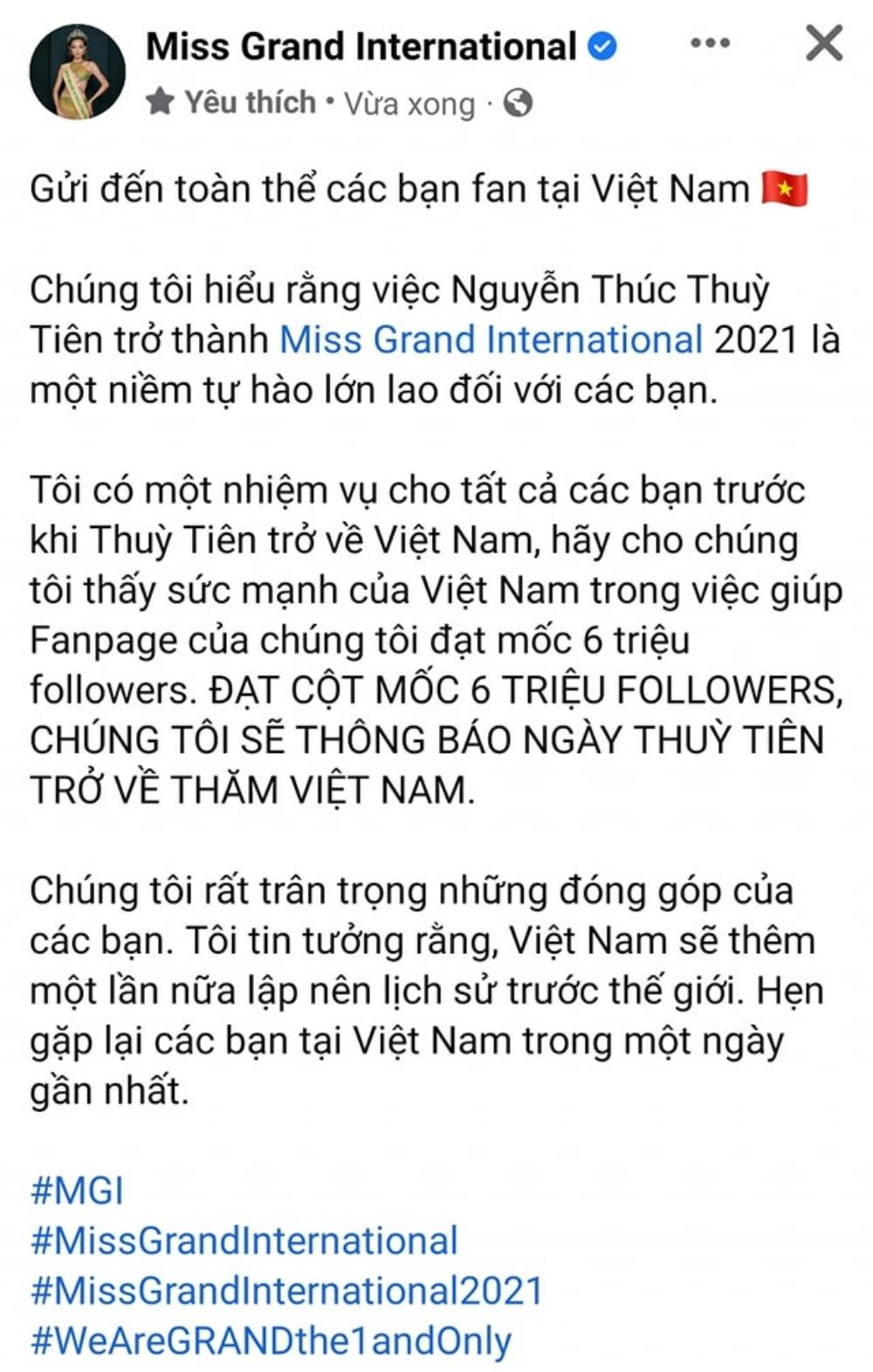 Biết được người hâm mộ đang vô cùng ngóng chờ Hoa hậu Thùy Tiên về nước, vào ngày 9/12, Chủ tịch Miss Grand International, ngài Nawat Itsaragrisil đã đưa ra một thông báo khá vui vẻ, kèm theo một điều kiện để Thùy Tiên về nước. Theo đó, người hâm mộ Việt phải giúp cho fanpage Miss Grand International đạt cột mốc 6 triệu followers, ngài Nawat sẽ thông báo ngày Thùy Tiên trở về thăm Việt Nam (ở thời điểm thông báo được đưa ra, fanpage có 4,6 triệu followers).