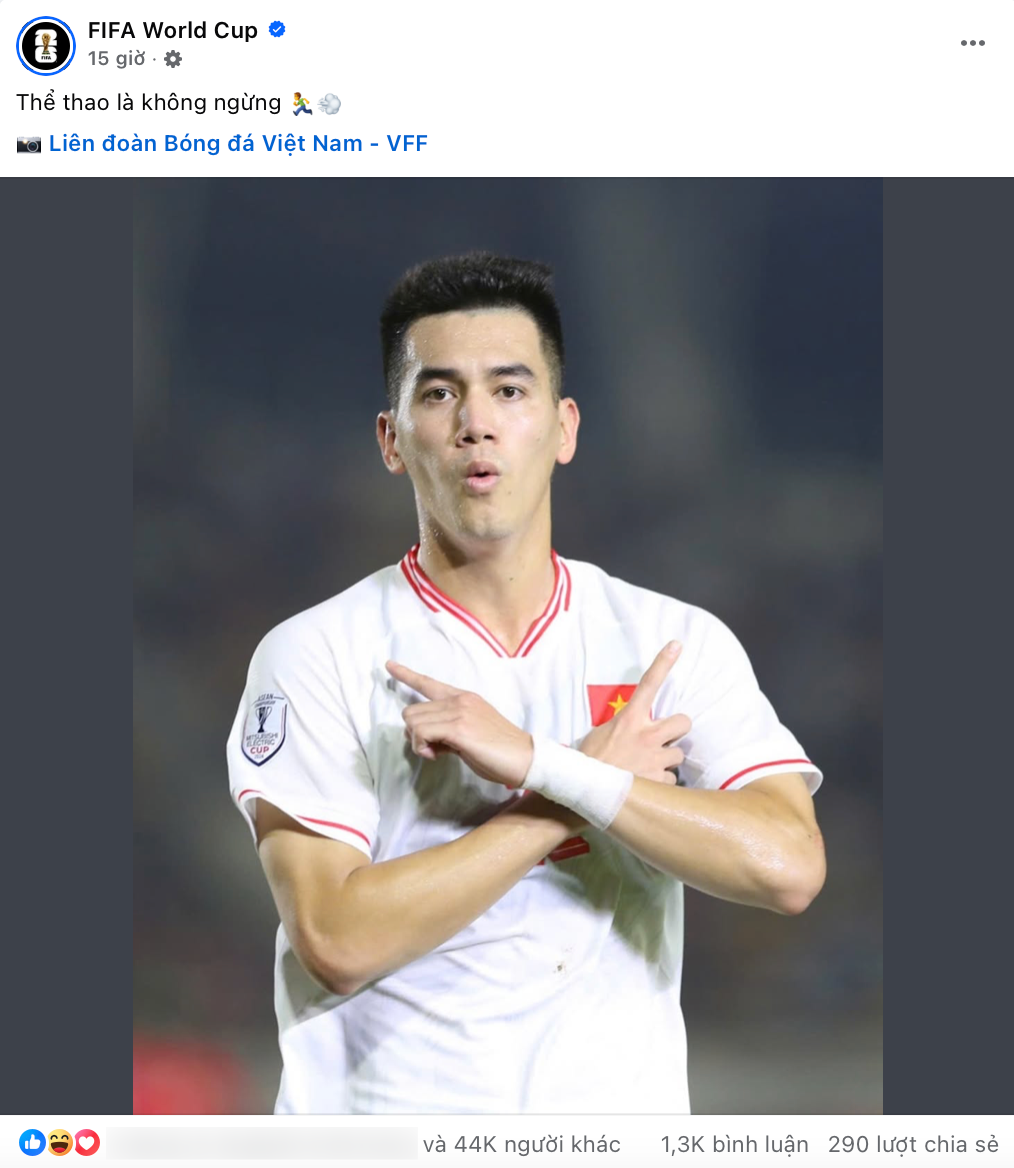 Sau chiến thắng này, fanpage có tick xanh Facebook FIFA World Cup với hơn 60 triệu lượt thích đã đăng tải dòng trạng thái: "Thể thao là không ngừng..." cùng biểu tượng một người nỗ lực chạy, kèm theo hình ảnh ăn mừng của cầu thủ Tiến Linh.