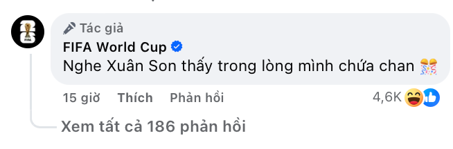 Bên cạnh đó, ở phía dưới phần bình luận, trang FIFA World Cup không quên nhắc đến cầu thủ Nguyễn Xuân Son với câu hát "chế" cực viral: "Nghe Xuân Son thấy trong lòng mình chứa chan". Sự hài hước trong những dòng trạng thái của FIFA World Cup tô điểm thêm vào chiến thắng của ĐT Việt Nam khiến người hâm mộ cũng như cộng đồng mạng tỏ ra thích thú.