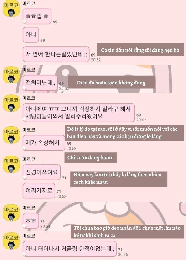 Theo @youandme0511, Marco đã đích thân ghé vào group chat của fan trên KakaoTalk để phủ nhận tin đồn hẹn hò của anh và Hyebin từng xuất hiện vào đầu năm 2019.