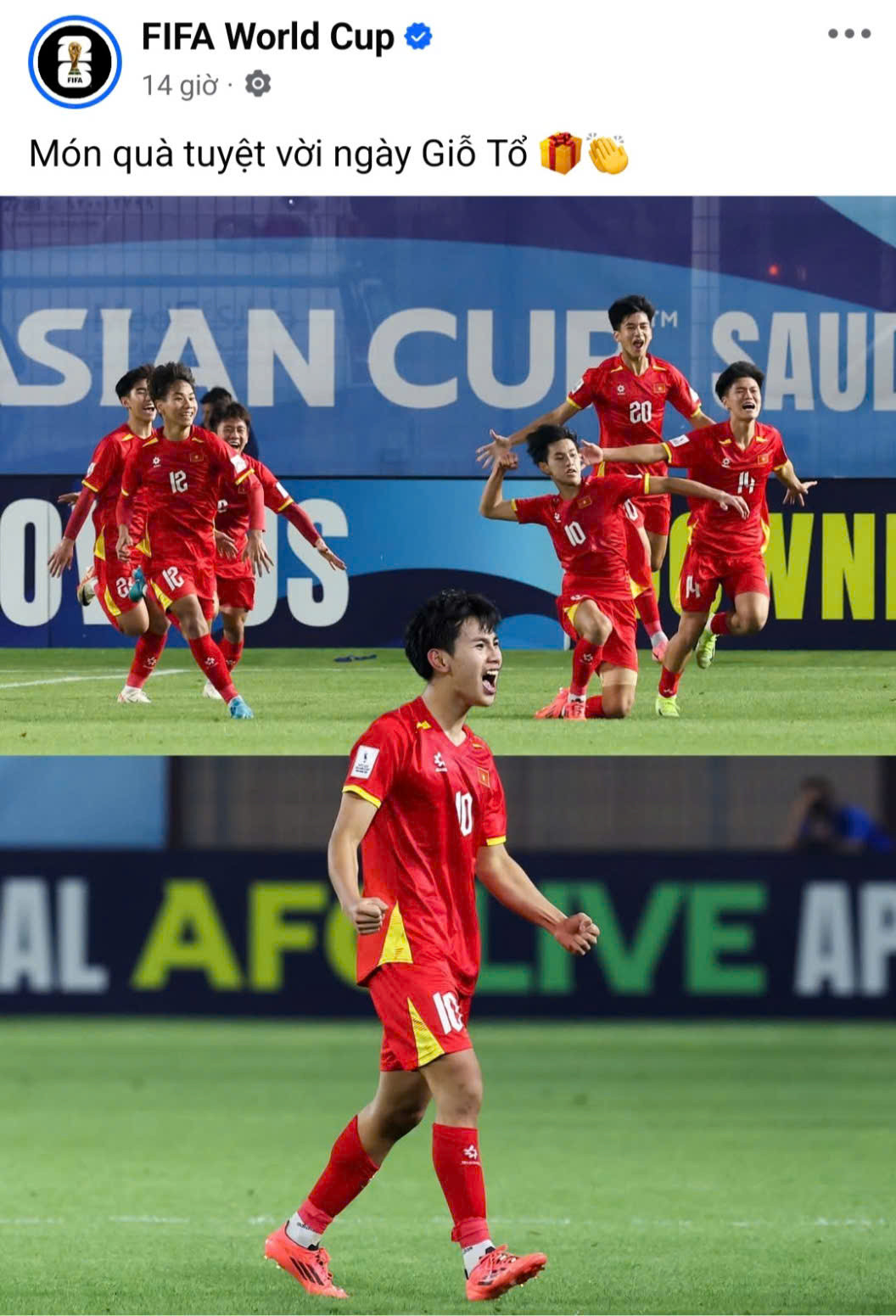 Sau trận đấu, trang FIFA World Cup đã đăng tải hình ảnh các tuyển thủ Việt Nam ăn mừng chiến thắng kèm dòng trạng thái: “Món quà tuyệt vời ngày Giỗ Tổ”.