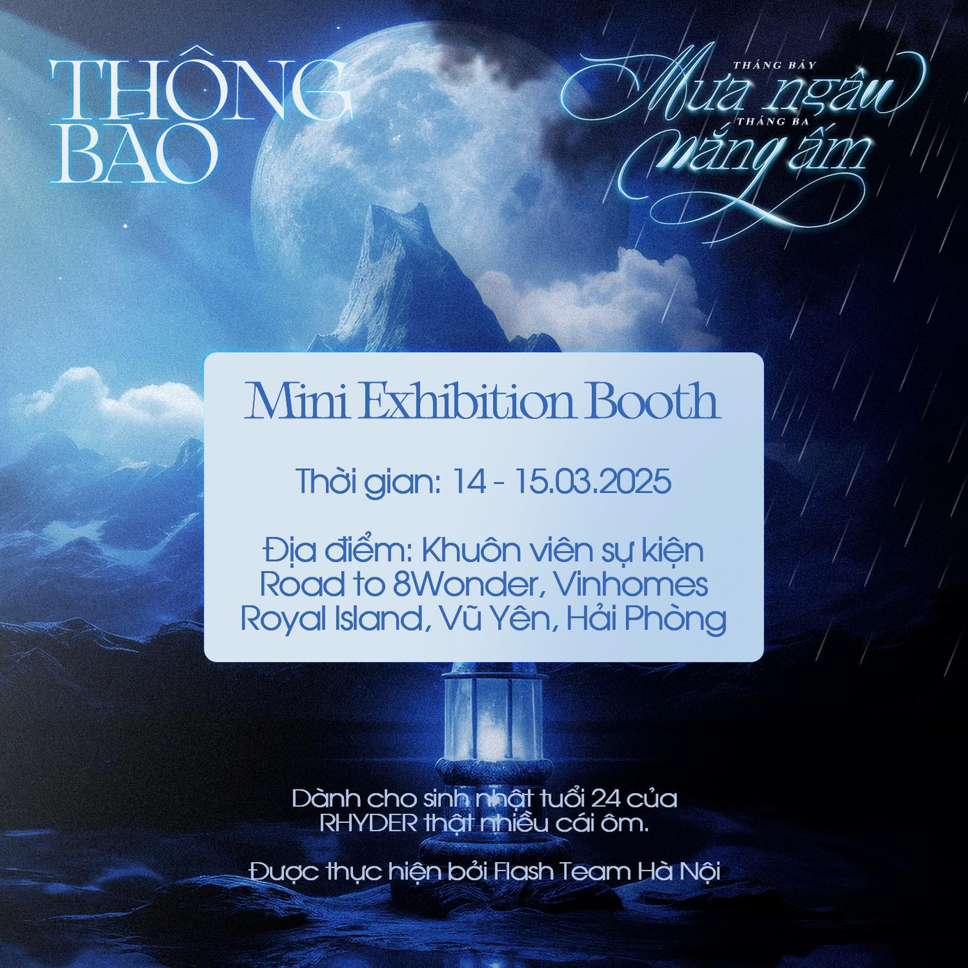 Ngoài ra, các bạn Flash còn có thể tới tham gia booth triển lãm, mở cửa tự do tại Sự kiện Road To 8Wonder - Vinhomes Royal Island (Vũ Yên, Hải Phòng) trong hai ngày 14 - 15/3/2025. Không gian triển lãm sẽ là nơi gói gọn hành trình theo đuổi âm nhạc hơn một thập kỷ qua của RHYDER, với những cột mốc đáng nhớ với cả nam ca sĩ và cộng đồng Flash.