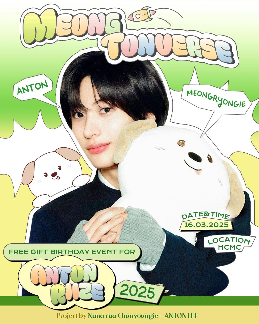 Đây là năm thứ hai, Nuna của Chanyoungie tổ chức tiệc offline dịp sinh nhật idol. Với chủ đề “Meongtonverse: 21st Adventure!”, buổi offline năm nay dự kiến được tổ chức lúc 13h ngày Chủ nhật 16/3/2025 tại Mono Square Cafe (TP.HCM). Vào dịp sinh nhật Anton Lee (21/3), FC RAWR Anton Lee - RIIZE Anton cũng rộn ràng chuẩn bị nhiều hoạt động nằm trong khuôn khổ project Dive in Tonny.