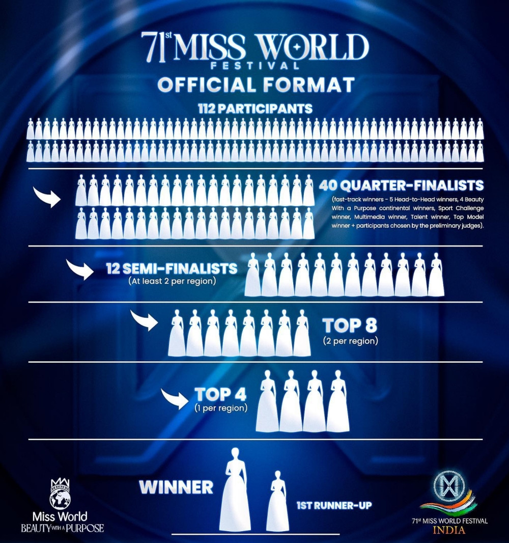 Từ Top 12 sẽ tiếp tục chọn ra Top 8, mỗi khu vực châu lục sẽ có 2 thí sinh. Từ Top 8 sau đó sẽ chỉ còn Top 4, mỗi thí sinh đại diện cho một khu vực châu lục. Sau đó sẽ công bố Top 2 bao gồm thí sinh giành vương miện Hoa hậu Thế giới lần thứ 71 và Á hậu 1. Như vậy, cuộc thi năm nay sẽ chỉ có Hoa hậu và một Á hậu, khá giống với format của cuộc thi Hoa hậu Hoàn vũ Việt Nam năm 2023.