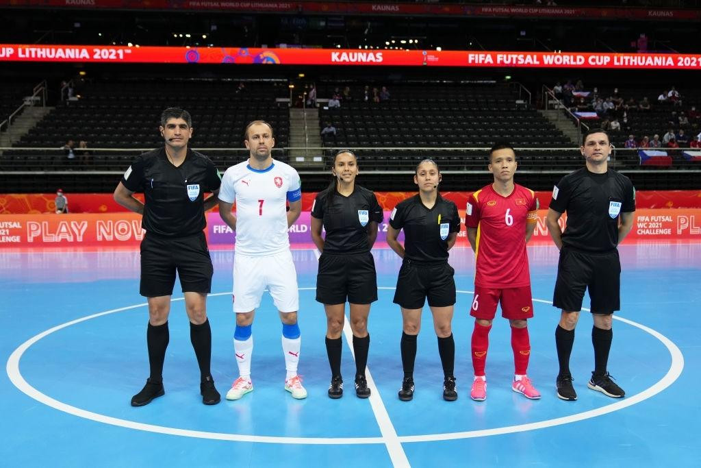 Trọng tài bắt chính trận đấu giữa đội tuyển Việt Nam- Czech là bà Maria Estefania Pinto, người Argentina. Trọng tài thứ hai là bà Valeria Palma, người Chile. Đây là cặp trọng tài nữ đầu tiên cầm còi ở FIFA Futsal World Cup.