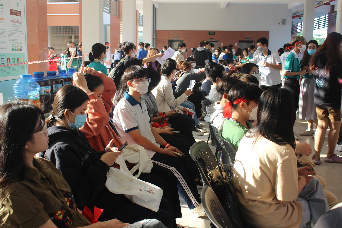 | Rất đông các bạn sinh viên ngồi tại sảnh B4 chờ đến lượt khám sàng lọc, hiến máu. |