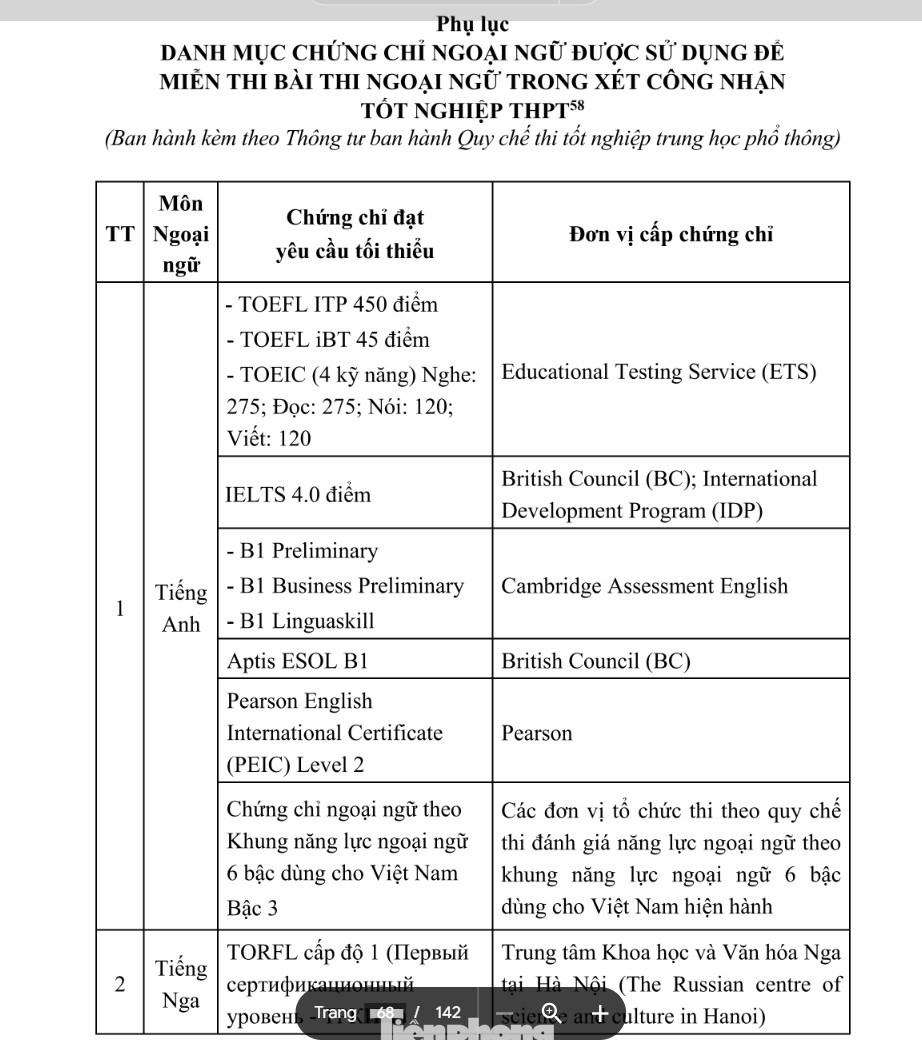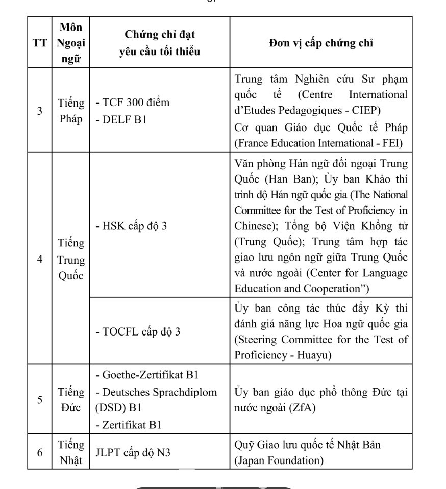 Theo ông Chương danh mục các chứng chỉ ngoại ngữ này có một số chứng chỉ mới. Thí sinh cần đặc biệt lưu ý các chứng chỉ ngoại ngữ phải có giá trị sử dụng đến ngày 26/6/2024.