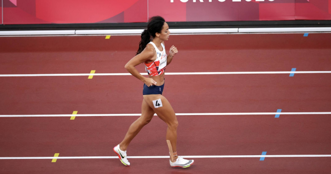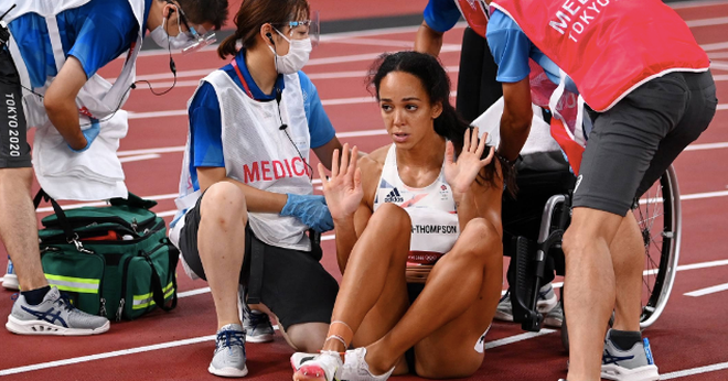 Cơn đau ở bắp chân phải khiến Johnson-Thompson không thể chịu đựng thêm và gục ngã. Những giọt nước mắt bắt đầu rơi, cô ôm mặt nằm lăn lộn trên sân đầy đau đớn.