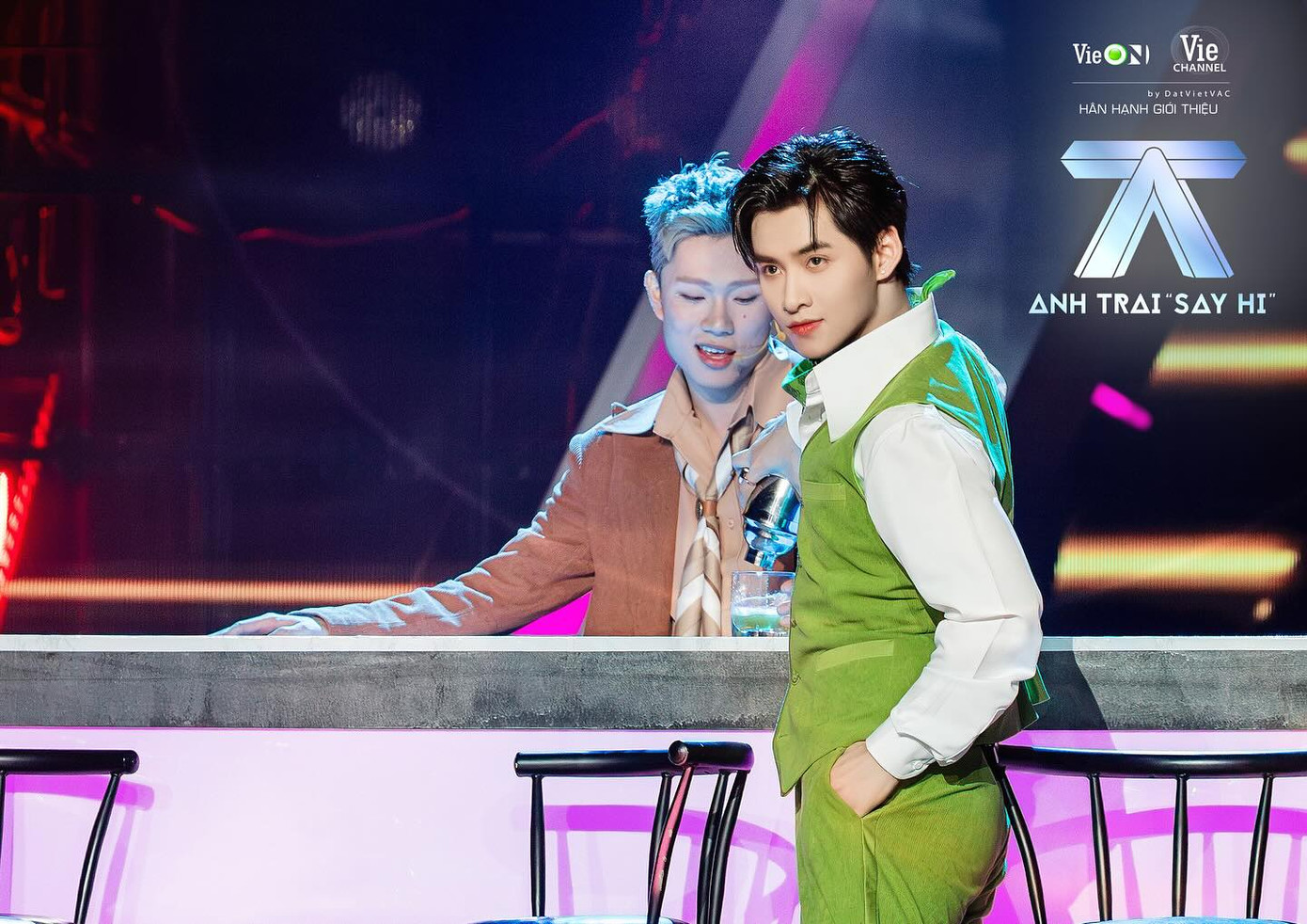 Trình diễn ca khúc Bảnh, sao nam 9X nổi bật giữa 14 anh trai thuộc Liên quân 2 dù thời lượng lên hình ít ỏi. Hùng Huỳnh “cân đẹp” âu phục xanh lá kén da, hút mắt khi show tài lẻ bartender ngay trên sân khấu.
