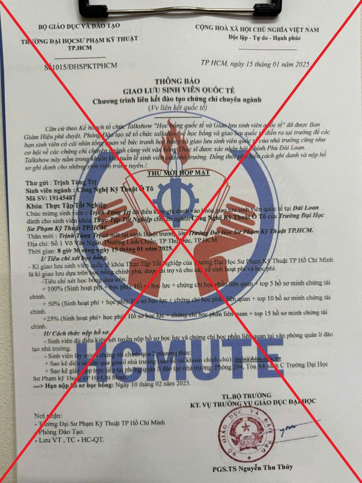 Bên cạnh thư giả mạo chữ ký của Hiệu trưởng Trường ĐH Sư phạm Kỹ thuật TPHCM, cùng thời điểm Trường ĐH Sư phạm Kỹ thuật TPHCM còn bị giả mạo một văn bản của Vụ Giáo dục ĐH do Vụ trưởng Nguyễn Thu Thủy ký cũng nêu về việc chương trình học liên kết…