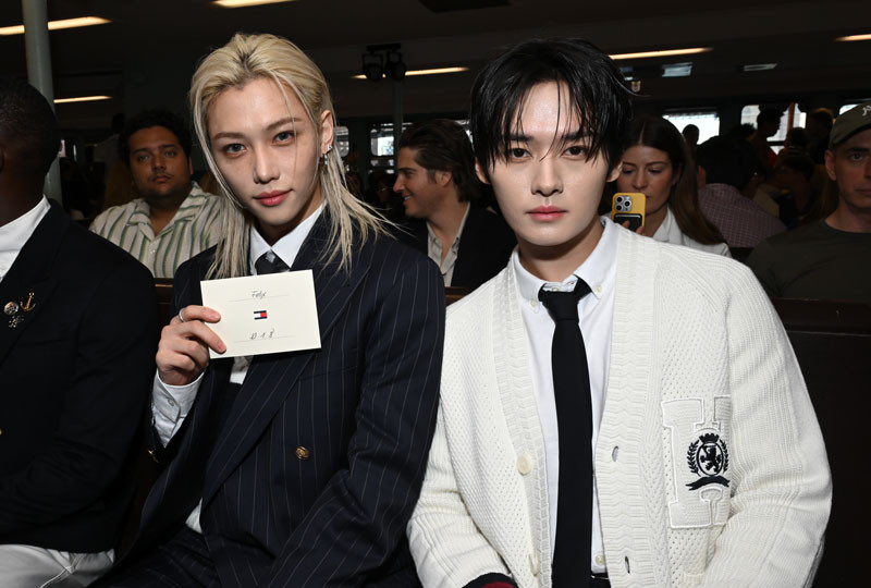 Cùng xuất hiện tại show của Tommy, hai thành viên của Stray Kids lịch lãm đúng với tinh thần nhà mốt. Trong khi Lee Know diện áo len Cardigan màu ngà cổ điển bên ngoài áo sơ mi trắng, Felix xuất hiện với quần kẻ sọc và áo khoác blazer cùng màu.