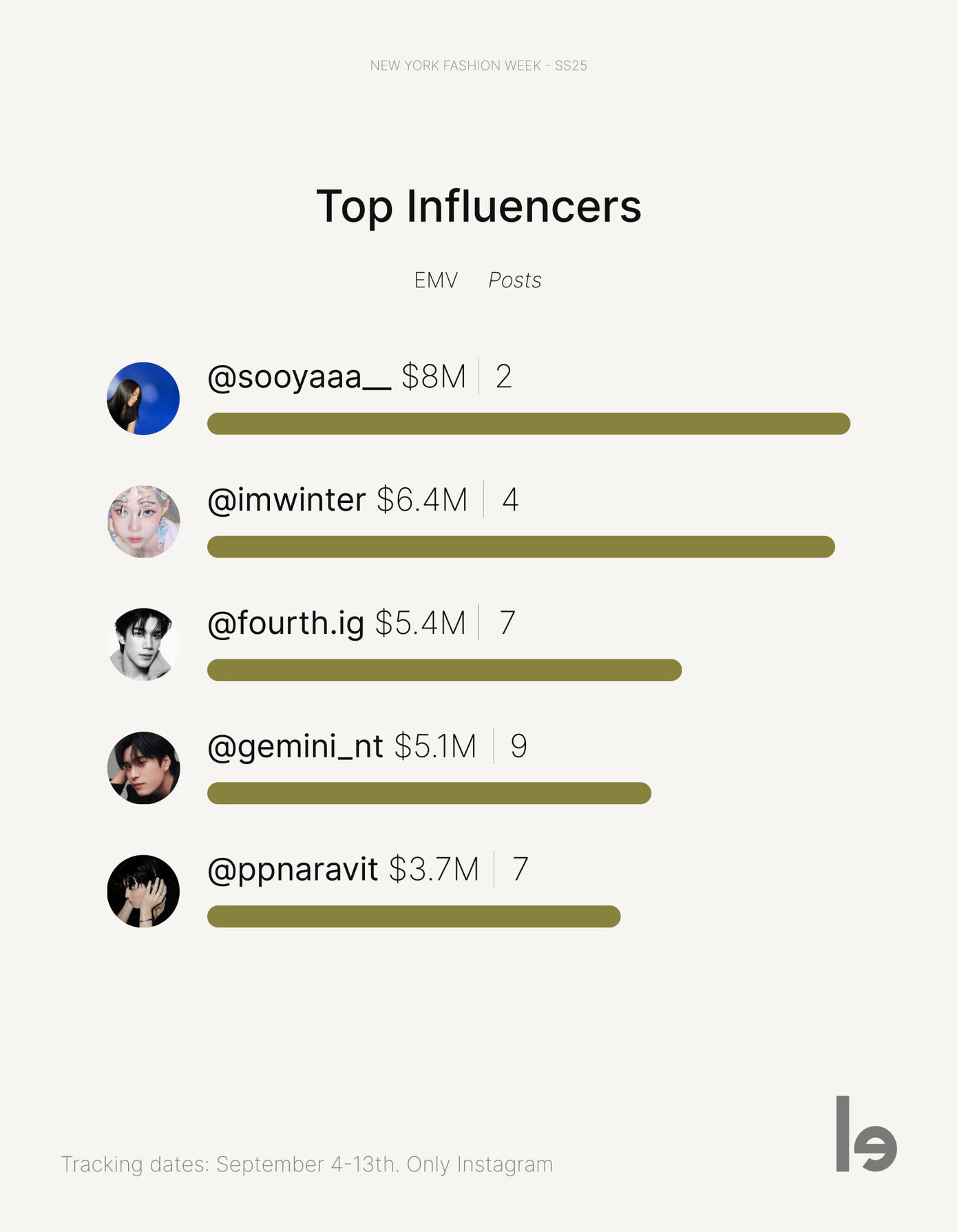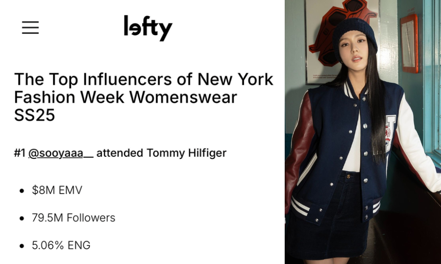 Tại show của Tommy Hilfiger, Jisoo (BLACKPINK) leo thẳng lên Top 1 "Người có sức ảnh hưởng nhất" tại New York Fashion Week Xuân Hè 2025 với giá trị truyền thông (EMV) là 8 triệu USD (tương đương 196 tỷ VNĐ), theo trang web phân tích phương tiện truyền thông và thời trang/người có sức ảnh hưởng Lefty.