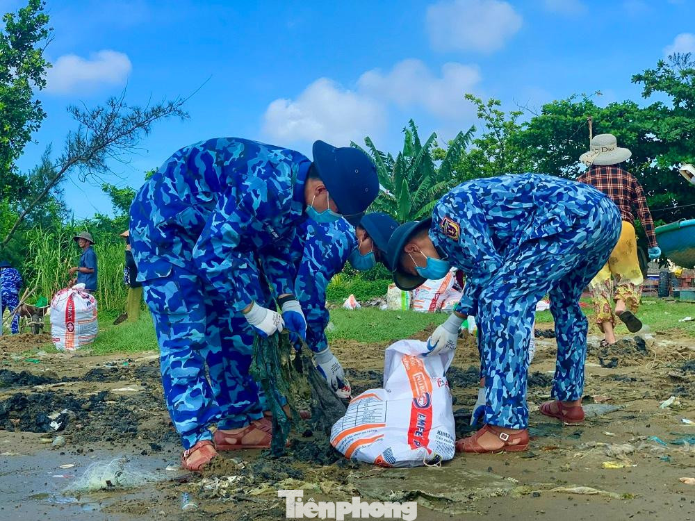 | Các chiến sĩ bộ đội biên phòng và các chiến sĩ cảnh sát biển Hải đoàn 23 (Bộ Tư lệnh vùng Cảnh sát biển 2) tham gia dọn sạch bờ biển. |