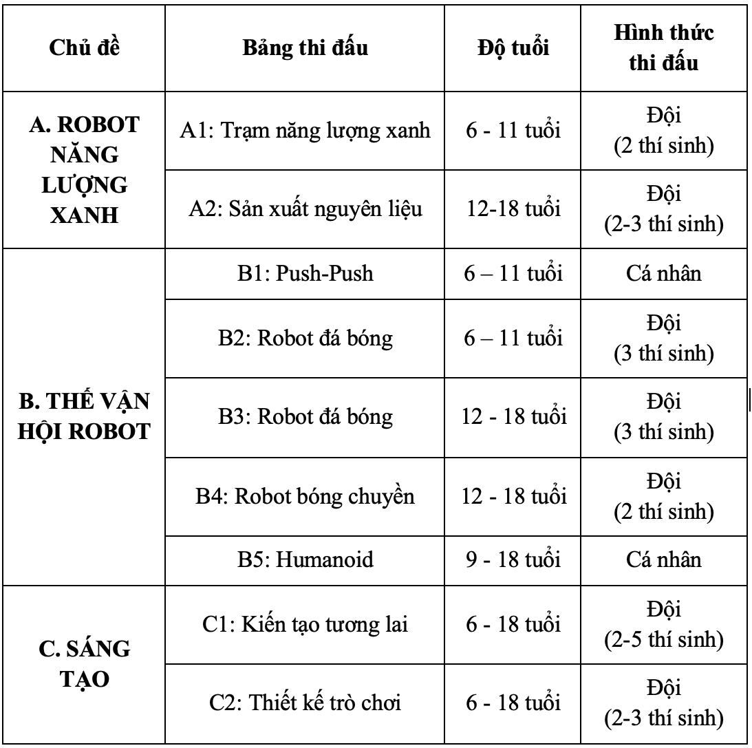 Dành cho học sinh yêu thích STEM, AI và ROBOTICS có độ tuổi từ 6 đến 18 tuổi (Học sinh có năm sinh từ 2006 đến 2018).
