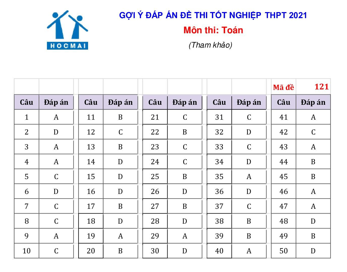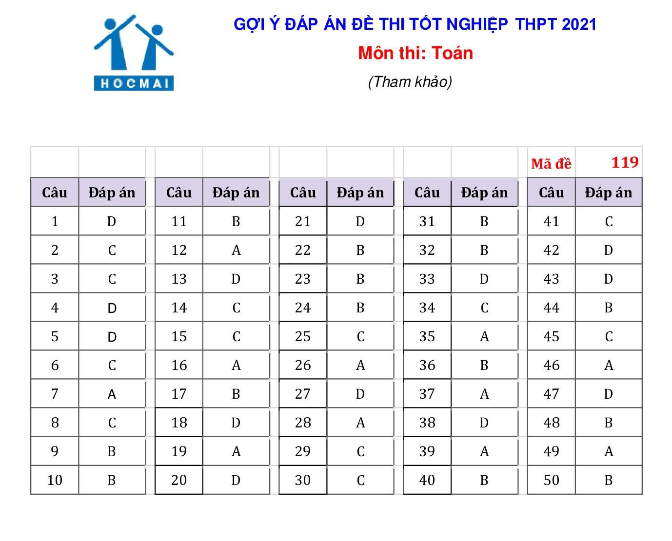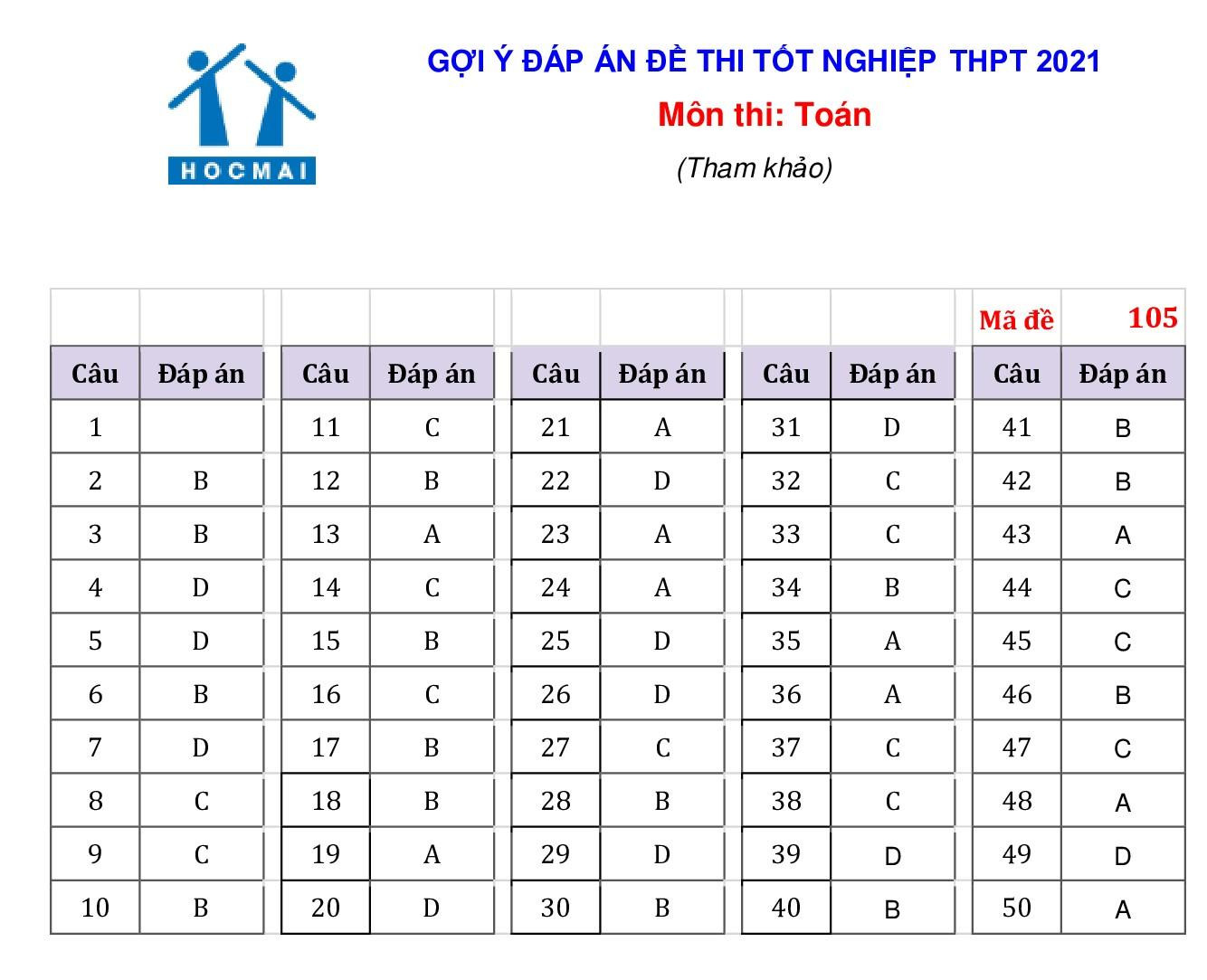 Gợi ý đáp án 4 mã đề 119, 121, 105 và 115 như sau: