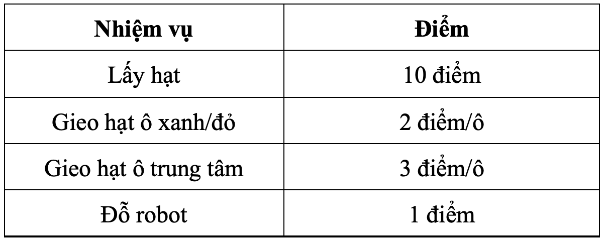 Robot thực hiện đúng nhiệm vụ sẽ được tính điểm theo bảng sau: