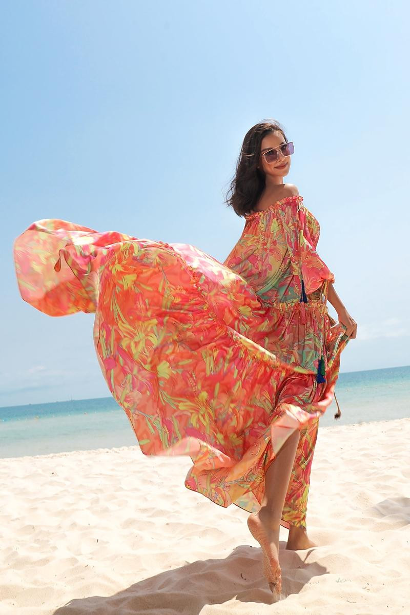 Phần lớn các thiết kế là dáng đầm maxi bay bổng, nhiều màu sắc kết hợp với hiệu ứng xẻ tà, hở lưng, chiết eo, bèo nhún,… tạo điểm nhấn giúp làm nổi bật những đường cong trên cơ thể của phái nữ.