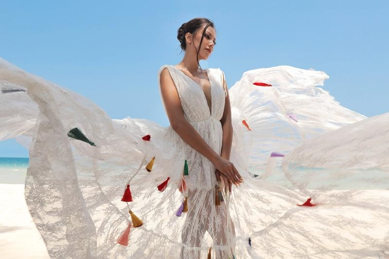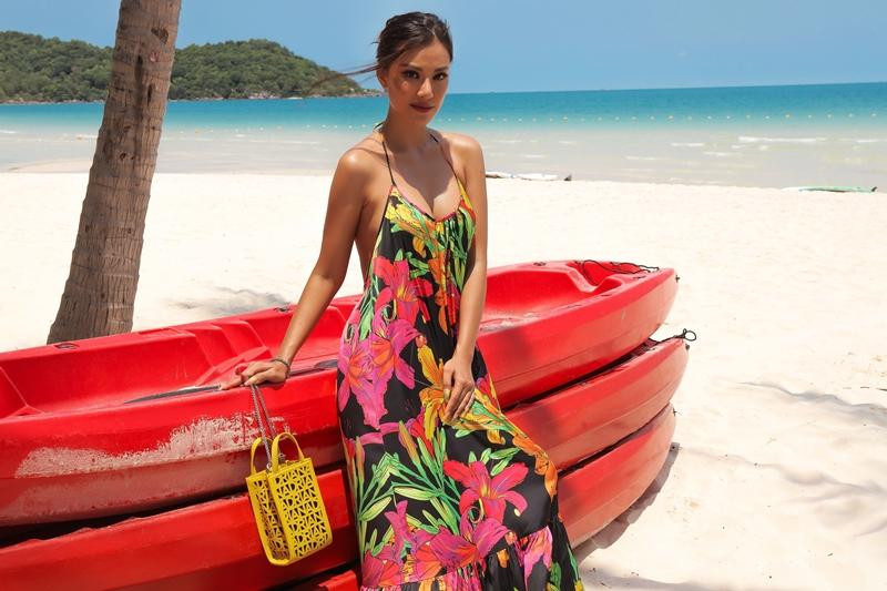 Với những kiểu đầm yếm khoe lưng trần, người đẹp Kim Duyên kết hợp với kiểu tóc búi hơi rối, tạo nét đẹp nhẹ nhàng,… khoe trọn bờ vai xinh dưới nắng. Nàng hậu cũng không quên tận dụng các phụ kiện đi kèm như chiếc túi xách với gam màu nổi bật.
