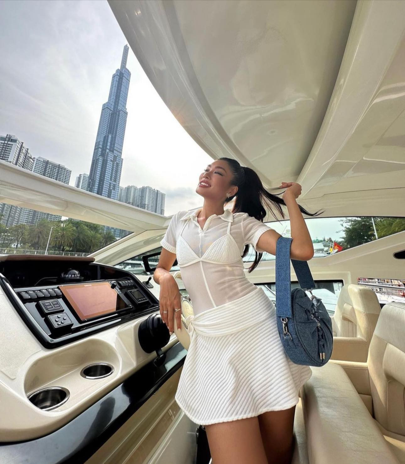 Mới đây, Thảo Nhi Lê khoe bộ ảnh sang chảnh bên du thuyền nhưng bên cạnh gương mặt đẹp sắc sảo, bộ đồ nàng hậu mặc trên người cũng gây xôn xao. Bởi Thảo Nhi Lê diện áo chíp màu trắng ra ngoài áo thun mỏng đồng màu.