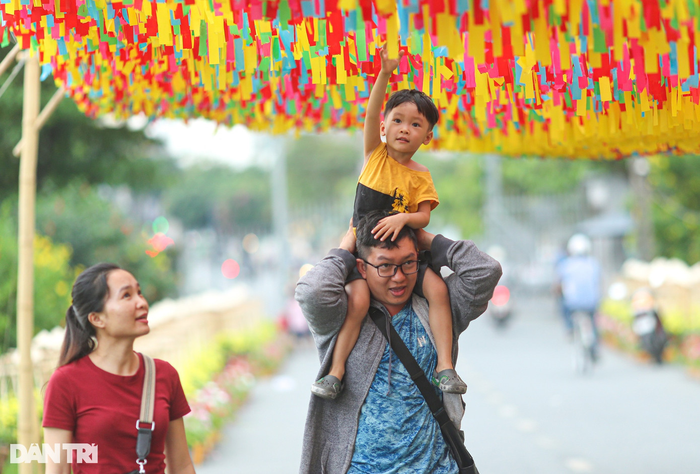 Hai bên lối vào và dọc tuyến đường trong công viên được trang trí các gánh hoa, nón lá... Nhiều gia đình tranh thủ thời gian đưa con nhỏ tới dạo chơi, thưởng thức không gian Tết sớm.