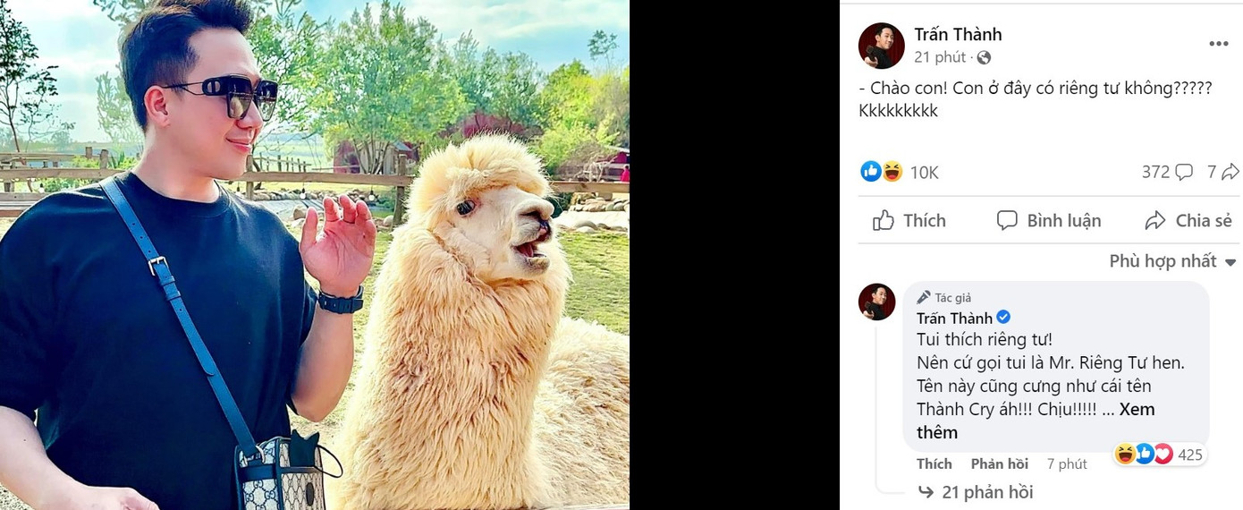 Trong bài đăng mới đây trên trang cá nhân, Trấn Thành đã chia sẻ bức ảnh với nội dung về sự riêng tư. Dưới phần bình luận, ‘đạo diễn trăm tỷ’ này còn hài hước thừa nhận: “Tui thích riêng tư! Nên cứ gọi tui là Mr. Riêng Tư hen. Tên này cũng cưng như cái tên Thành Cry áh! Chịu! Nhận luôn. Khỏi khịa. Cho zừa lòng mấy thánh. I'm mr. RIÊNG TƯ”.