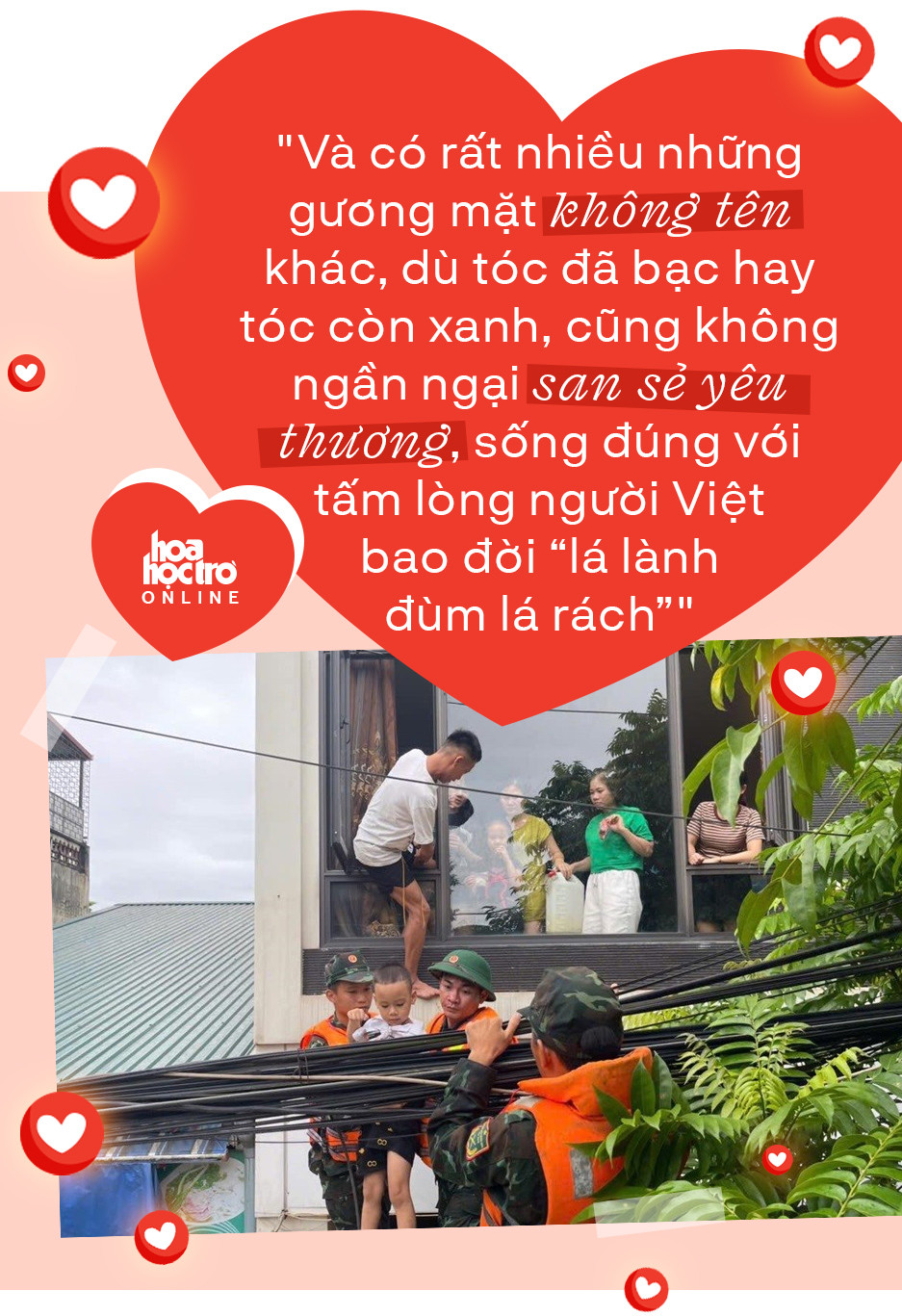 Đó có thể là một cá nhân, có thể là một tập thể, có thể được gọi tên hoặc chưa kịp được nhớ mặt. Là GS.TS Lê Ngọc Thạch ở miền Nam ủng hộ 1 tỷ đồng, vốn là tiền tiết kiệm ông để dành nhiều năm qua. Là những chiếc xe tải từ Móng Cái - Quảng Ninh mang theo những thùng mì, nước đóng chai, sữa, thẳng tiến tới những vùng khác cũng chịu ảnh hưởng của bão lũ dù đây cũng là nơi bị bão Yagi hành hạ.