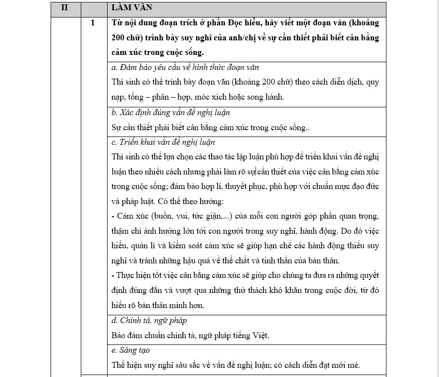 Câu 1 (2,0 điểm): Câu lệnh đã cung cấp đầy đủ và chính xác các yêu cầu cụ thể để thí sinh có thể viết một đoạn văn với dung lượng khoảng 200 chữ về một khía cạnh của vấn đề rút ra từ đoạn trích của phần đọc hiểu, đó là yêu cầu “Từ nội dung đoạn trích ở phần Đọc hiểu - "Hãy viết một đoạn văn (khoảng 200 chữ) trình bày suy nghĩ của anh/chị về sự cần thiết phải biết cân bằng cảm xúc trong cuộc sống”.