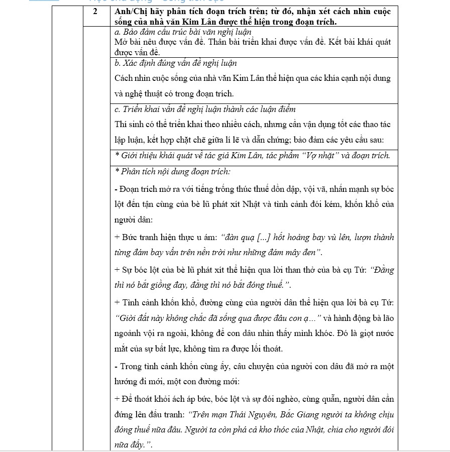 Câu 2 (5,0 điểm): Câu nghị luận văn học vẫn sử dụng cấu trúc đề quen thuộc: sau trích đoạn cuối cùng của truyện ngắn Vợ nhặt là một câu lệnh có 2 vế tương ứng với 2 yêu cầu: Phân tích đoạn trích trong truyện ngắn và “nhận xét cách nhìn cuộc sống của nhà văn Kim Lân được thể hiện trong đoạn trích”.