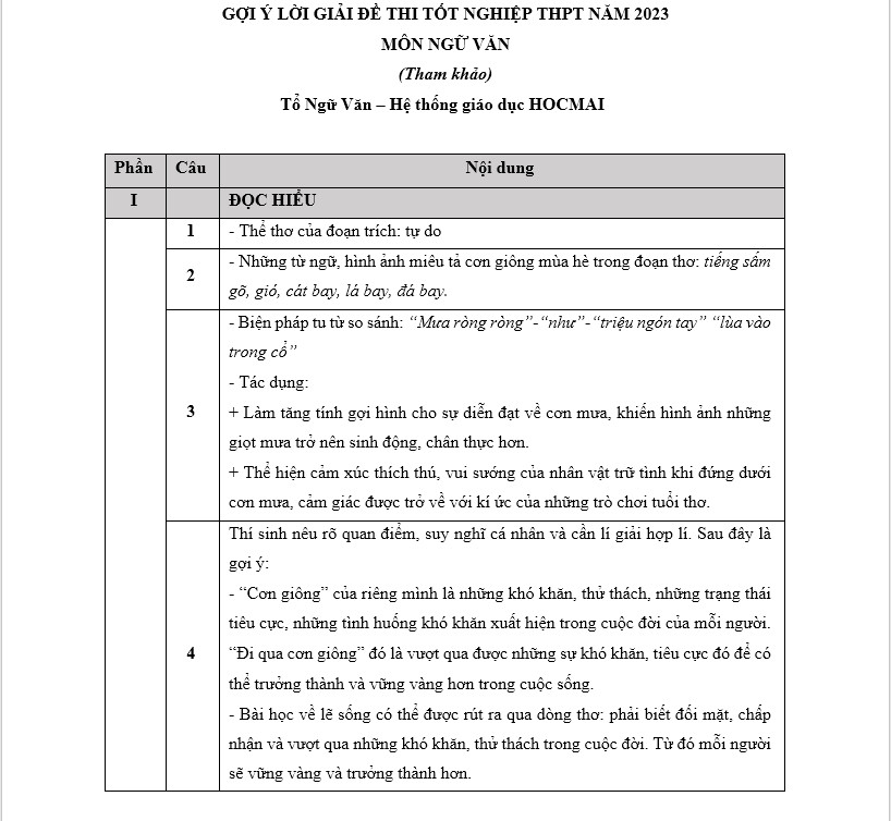 Dưới đây là đáp án tham khảo do tổ Ngữ văn - Hệ thống giáo dục HOCMAI thực hiện, mời thí sinh tham khảo: