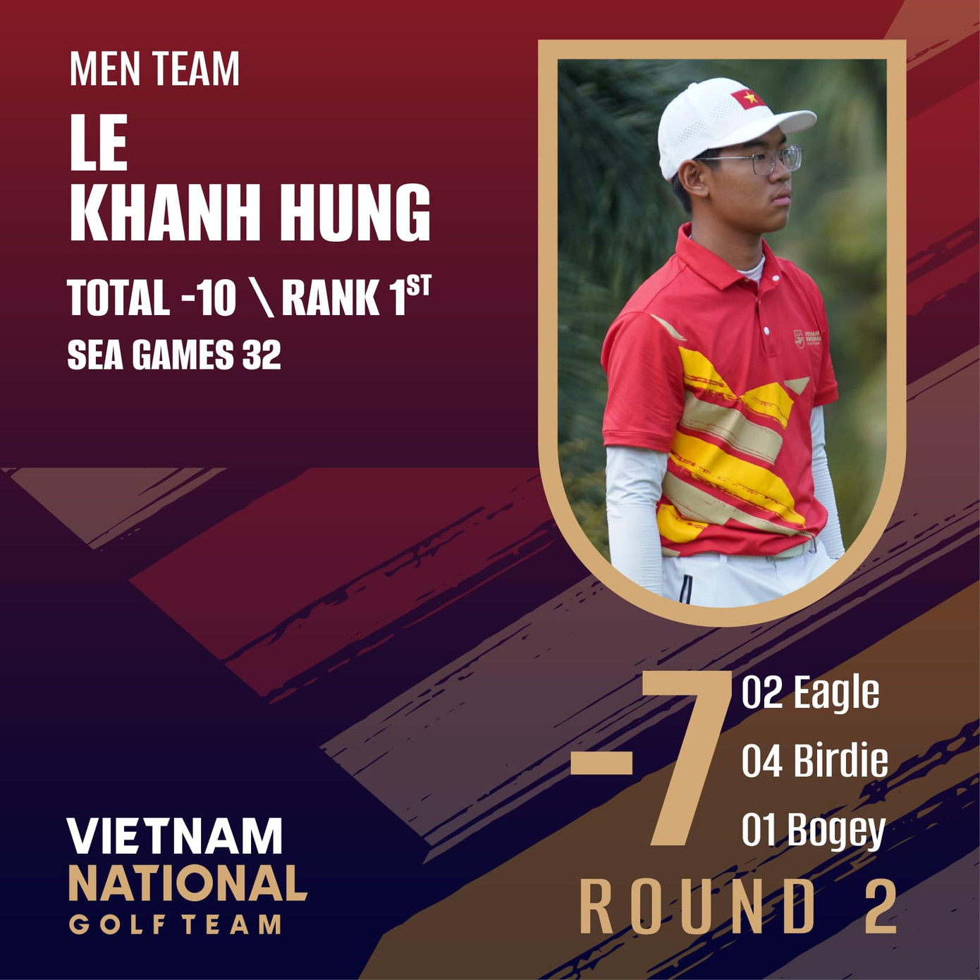 Trong ngày thi đấu hôm nay, Lê Khánh Hưng có 2 Eagle ở hố số 8 và hố số 11, ghi 4 birdie và chỉ mắc 1 bogey để kết thúc 18 hố với điểm (-7). Anh tiếp tục dẫn đầu BXH sau 2 vòng với tổng điểm (-10).