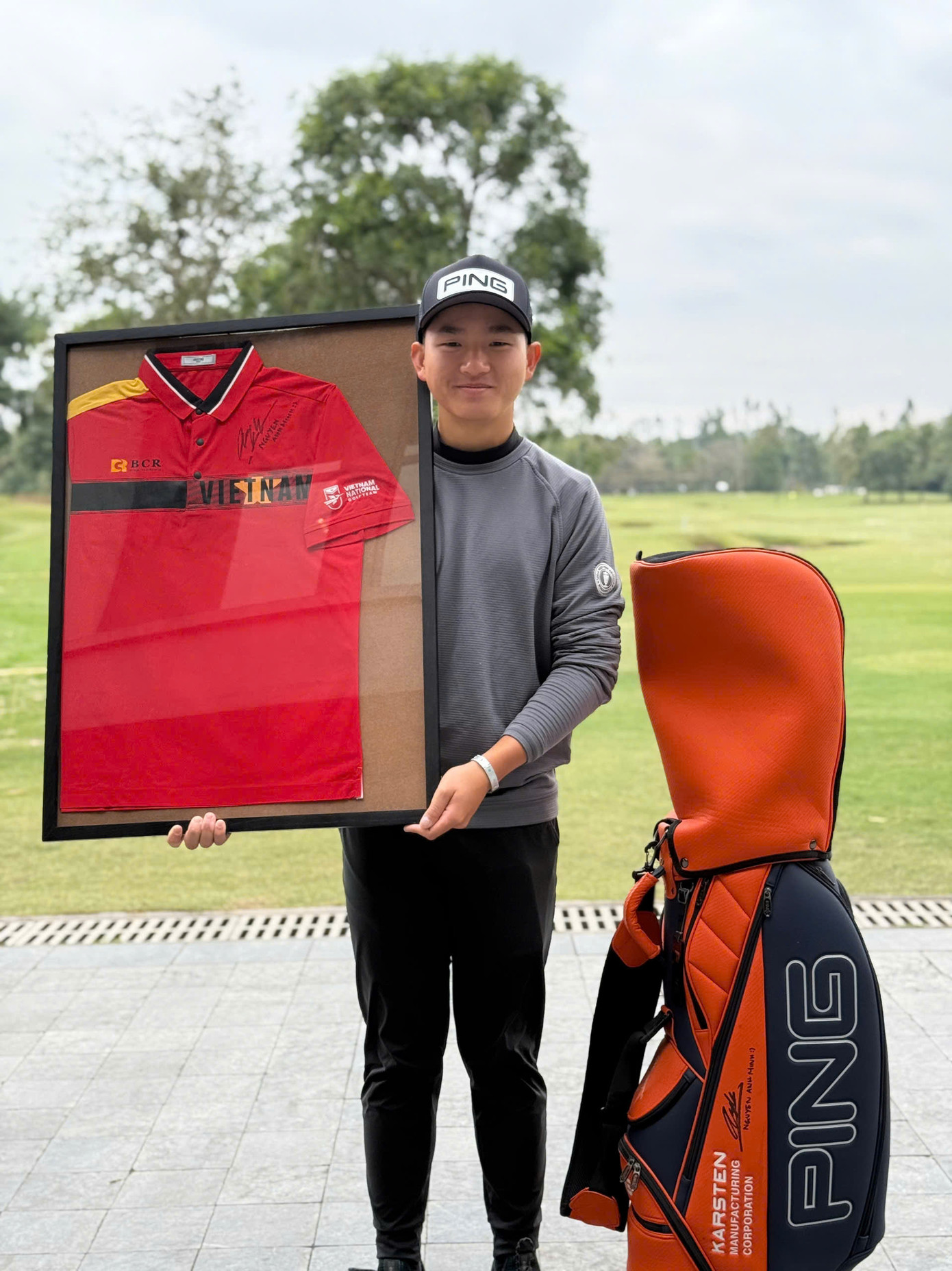 | Chiếc áo đấu và túi gậy có chữ ký của Nguyễn Anh Minh, golfer nghiệp dư số 1 Việt Nam. |