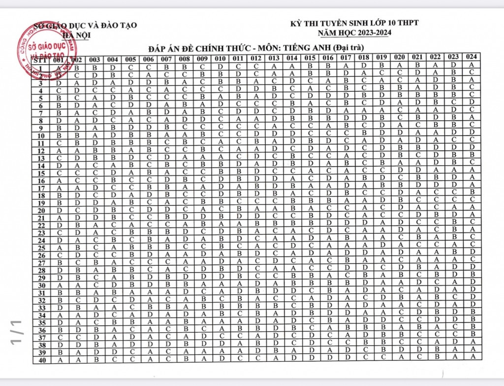 Dưới đây là đáp án 24 mã đề thi môn Ngoại ngữ. Dự kiến muộn nhất ngày 4/7, Hà Nội sẽ công bố điểm cho tất cả thí sinh dự thi.