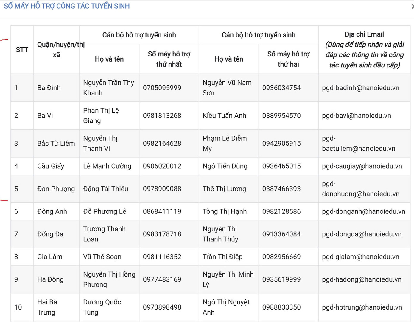 Phụ huynh tra cứu danh sách các số điện thoại hỗ trợ tuyển sinh đầu cấp của 30 quận, huyện, thị xã của TP Hà Nội như sau: