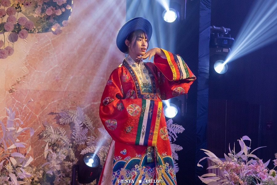| Top 12 Đại sứ của trường gây ấn tượng trong phần thi trang phục truyền thống. |