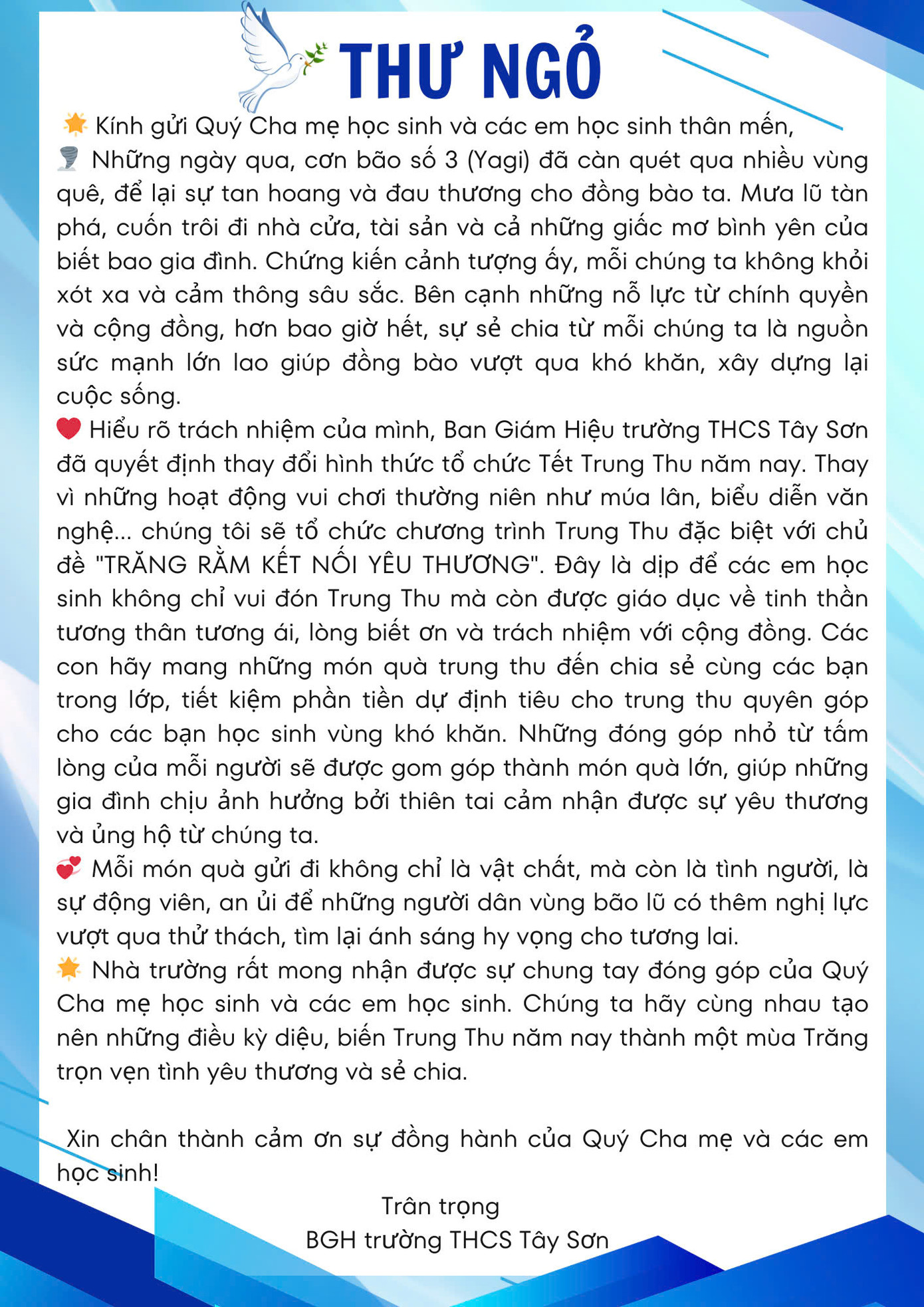 Trường THCS Tây Sơn chọn thay đổi hình thức tổ chức hoạt động Trung Thu. Thay vì các hoạt động vui chơi thường niên như múa lân, văn nghệ..., nhà trường quyết định tổ chức chương trình đặc biệt với chủ đề "Trăng rằm kết nối yêu thương". Các bạn học sinh sẽ tiết kiệm phần tiền dự định dùng cho Trung Thu để quyên góp cho các bạn học sinh vùng khó khăn, chịu ảnh hưởng do thiên tai.