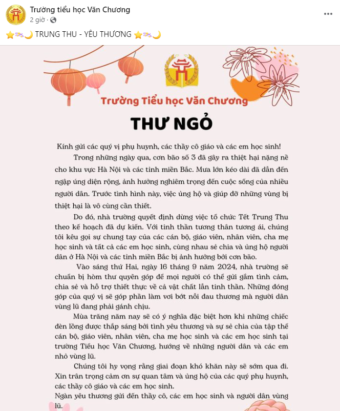 Thư ngỏ của trường Tiểu học Văn Chương viết nhà trường quyết định dừng tổ chức Tết Trung Thu, đồng thời kêu gọi toàn trường chung tay ủng hộ đồng bào miền Bắc. Ngày 16/9, trường dự kiến chuẩn bị hòm thư quyên góp "để mọi người có thể gửi gắm tình cảm, chia sẻ và hỗ trợ thiết thực về cả vật chất lẫn tinh thần".