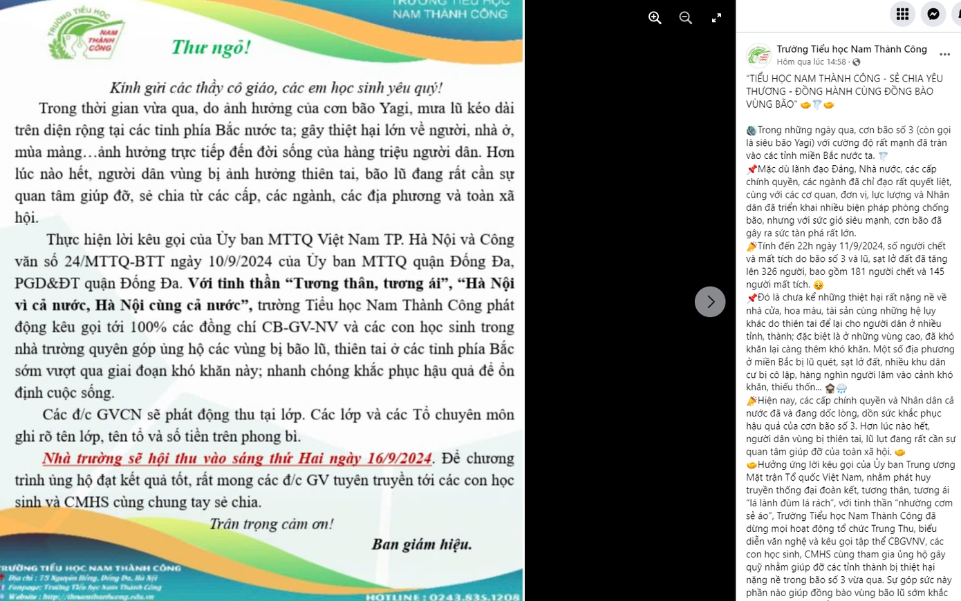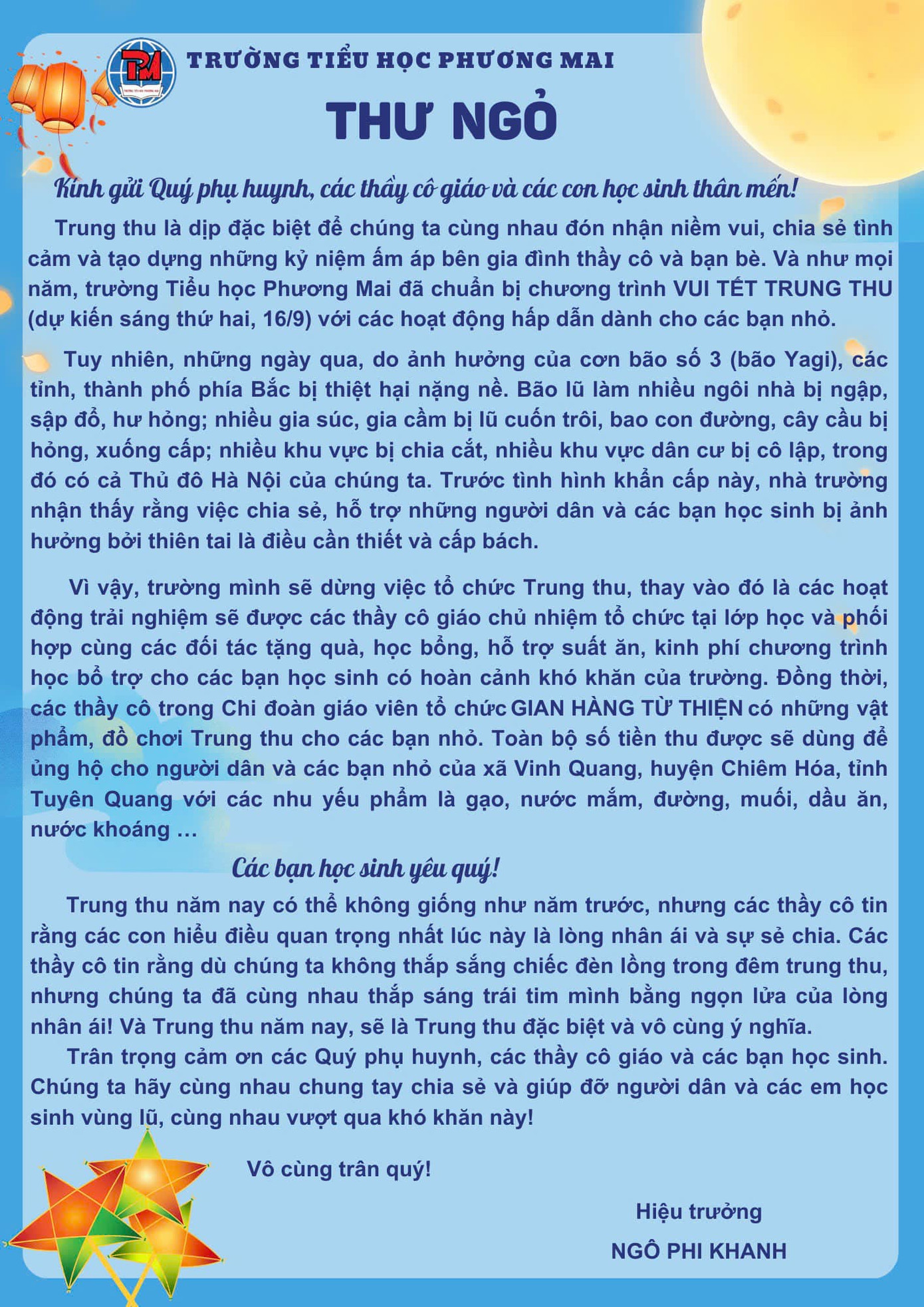 | Trường Tiểu học Cát Linh đăng thư ngỏ, thông báo dừng tổ chức chương trình Trung Thu và kêu gọi đóng góp, ủng hộ người dân cũng như các em học sinh vùng bão lũ. |