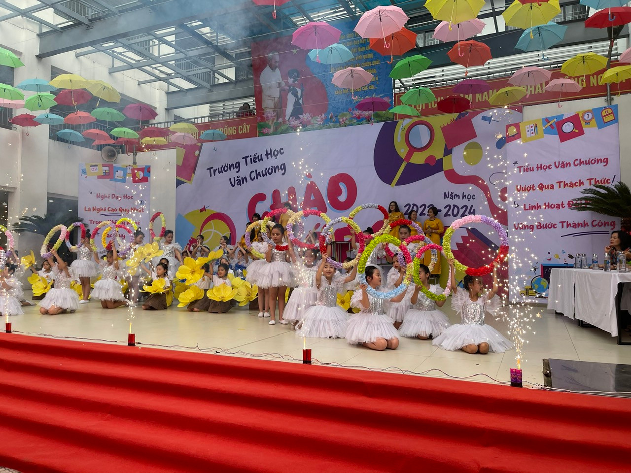| Sân khấu được trang trí rực rỡ với những chiếc ô treo lơ lửng, thu hút ánh nhìn của tween. |