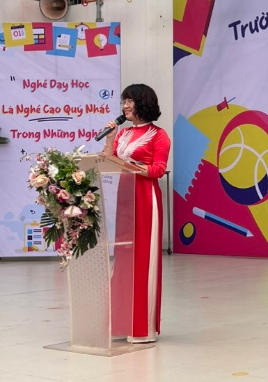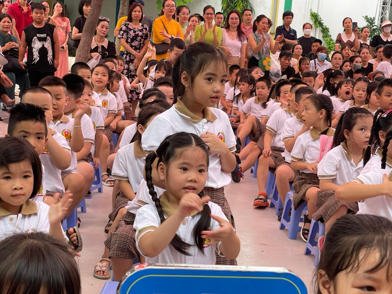 Hiệu trưởng nhà trường, nhà giáo Hoàng Thúy Nga gửi lời chào tới các bạn nhỏ và phụ huynh, gửi kỳ vọng về một năm học mới với nhiều điểm sáng được tạo nên bởi các "tân binh" và nhà trường.