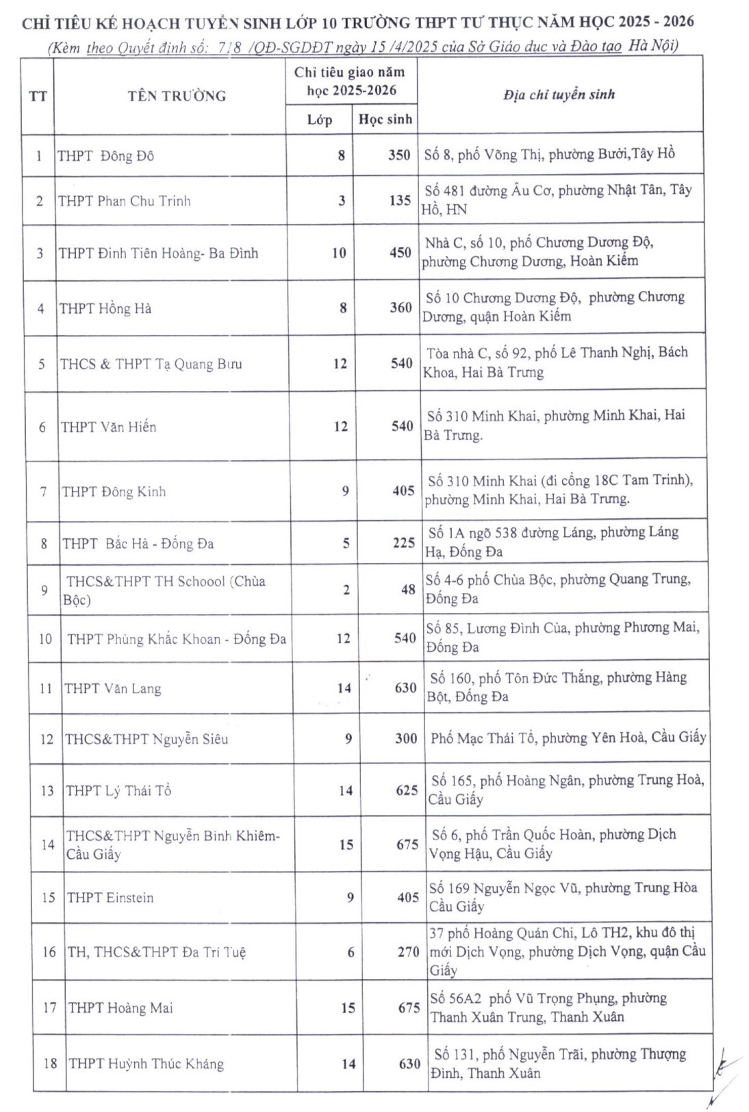 Năm ngoái, trong đợt đầu, Sở GD&ĐT Hà Nội cũng giao 29.636 chỉ tiêu tuyển sinh lớp 10 cho 85 trường THPT tư thục. Tuy nhiên, sau đó, sở này tiếp tục giao thêm chỉ tiêu tuyển sinh bổ sung cho một số trường đạt điều kiện.