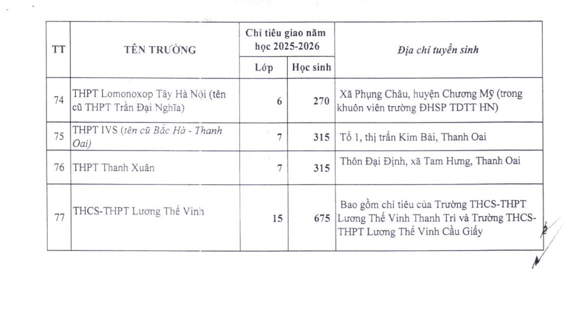 Nhóm trường được giao từ 600 chỉ tiêu trở lên gồm: THPT Văn Lang, THPT Lý Thái Tổ, THPT Huỳnh Thúc Kháng, THCS-THPT Marie Curie Long Biên, THPT Lạc Long Quân, THPT Đoàn Thị Điểm, THPT Phan Huy Chú.
